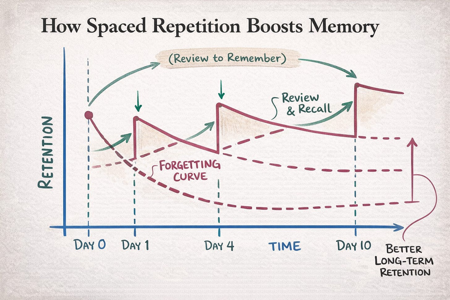Each return strengthens the neural trace, making recall faster and more durable.The timing matters more than the effort.